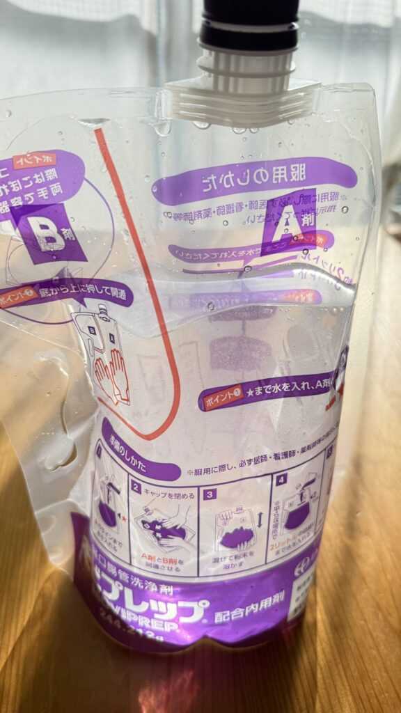 2リットルの水で溶かして、「便がほぼ透明!」になるまで飲みます。
