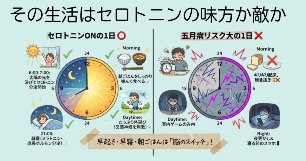 デジタルデバイスの制限:現代の子どもには、誘惑が多すぎますよね。親世代が幼少期になかったスマホやYouTubeなど。高度なアルゴリズム技術によって、快楽物質であるドーパミンが過剰分泌となり、「もっともっと」と依存状態になるように設計されています。また、視覚から入る明るい光が脳を興奮状態にさせ、夜になっても眠たくならなかったり、眠りが浅くなる要因となっています。