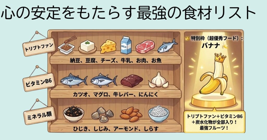 :セロトニンの原料となる「トリプトファン」(大豆製品、卵、肉、魚、バナナなど)や、その合成を助ける「ビタミンB6」(マグロ、カツオ、赤み肉、アボカドなど)を積極的に摂りましょう。時間がなければ、バナナ1本と牛乳だけでもOK!余裕があれば、おにぎりとお味噌汁、納豆やゆで卵などあればなおよいですね。